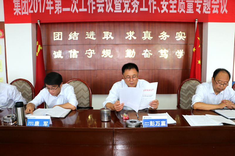 會(huì)議期間,集團(tuán)黨委副書記、副董事長(zhǎng)、總經(jīng)理唐軍同志代表集團(tuán)做了工作報(bào)告,總結(jié)2017年上半年工作,并安排布置了下半年的主要工作;集團(tuán)黨委副書記、紀(jì)監(jiān)委書記、副總經(jīng)理周永斌同志對(duì)集團(tuán)的黨務(wù)工作做了專題報(bào)告;集團(tuán)安全、生產(chǎn)、質(zhì)量監(jiān)察委員會(huì)主任顧友祥同志總結(jié)匯報(bào)集團(tuán)上半年安全生產(chǎn)、質(zhì)量管理工作情況、存在的具體問題、事故情況以及下一步如何做好安全生產(chǎn)、質(zhì)量管理所采取的措施和要求;集團(tuán)總顧問毛太鑾同志對(duì)如何進(jìn)一步加強(qiáng)建設(shè)工程施工和采礦安全、生產(chǎn)、質(zhì)量管理等方面的工作提出要求;集團(tuán)審計(jì)考核委員會(huì)、干部考核考察小組及有關(guān)單位分別作了專題匯報(bào)。最后,集團(tuán)黨委書記、董事長(zhǎng)彭萬(wàn)富同志進(jìn)行會(huì)議總結(jié),分析當(dāng)前形勢(shì),明確了2017年下半年的十項(xiàng)重點(diǎn)工作及完成時(shí)間、責(zé)任人和獎(jiǎng)懲辦法,進(jìn)一步闡述了組織紀(jì)律性和實(shí)事求是的原則。